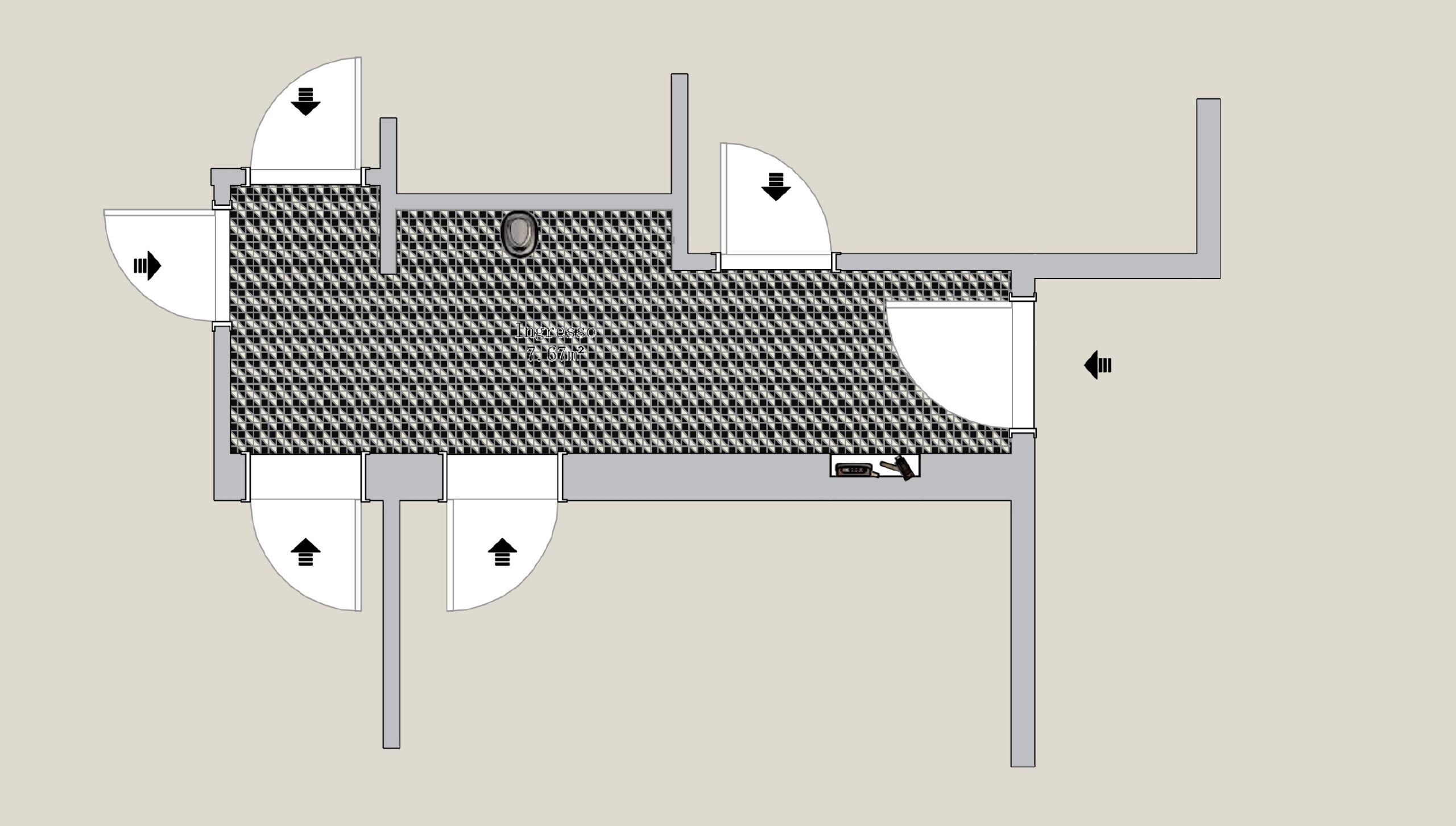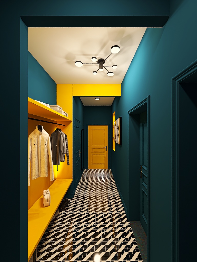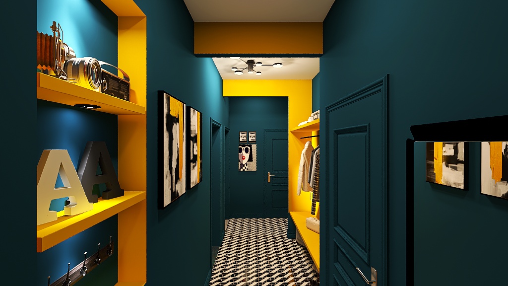 Per ridurre percettivamente la lunghezza dell’ingresso e spezzare la monotonia, ho creato delle vere e proprie pause visive gialle, inserendo: